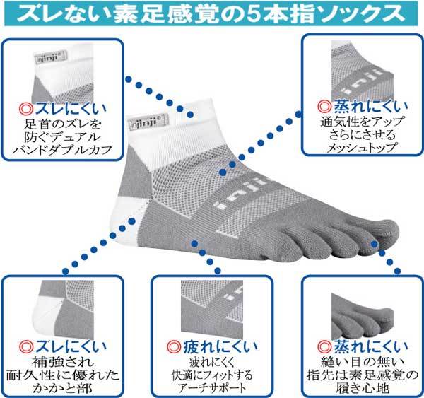 インジンジ ランシリーズは、ランニングに最適な5本指ソックス 。素材に湿気を逃し蒸れにくいクールマックスファブリックを採用し、足をいつも涼しく快適にしてくれます。メッシュトップ、吸水速乾、アーチサポート、縫い目の無い5本指は、靴擦れから指先を保護してくれます。マメができる・蒸れる・靴づれなど足に悩みを抱えるランナーは、ズレない素足感覚の5本指ソックス・指先までクッション性に優れたワンランク上の履き心地を一度お試しください。